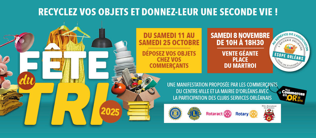 Du 11 octobre au 8 novembre, c’est la Fête du tri, à Orléans. L’évènement a pour objectif de donner une seconde vie aux objets inutilisés chez vous, pour assurer un cercle vertueux, en limitant la surconsommation et en réduisant la production de déchets. Mais il permet aussi de soutenir une cause, désignée chaque année, grâce aux bénéfices récoltés. “Les bénéfices reversés à l’association Hospi’Cool à l’issue de la précédente édition ont permis de financer la création de 2.700 blouses pour les soignants exerçant auprès des enfants hospitalisés !”, indique Alain Liger. Cette année, le choix du bénéficiaire s’est porté sur Esope.