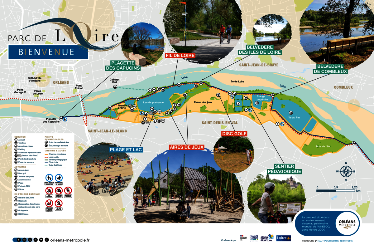 Le Parc de Loire, c’est la base de loisirs, mais pas seulement ! Fraîchement réaménagé par Orléans Métropole, le parc naturel urbain de 340 hectares s’étend du sentier des Tourelles, à l’ouest, en passant par les étangs de pêche jusqu'au Bois de l'Île à l’est. Traversé par l'itinéraire de la Loire à vélo, il comprend notamment le Fil de Loire et ses 7 km de promenade le long du fleuve, entre Orléans et Saint-Denis-en-Val, ainsi que de nombreux équipements. Un site idéal pour se balader à pied ou à vélo, pique-niquer, pêcher, naviguer, s’adonner à divers sports, au beach-volley, au frisbee sur le parcours de disc golf, à la pétanque ou à l’accrobranche, jouer, explorer en s'amusant avec la course d'orientation, découvrir le sentier pédagogique, observer la nature…